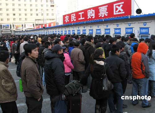 1月15日,北京西站廣場春運農(nóng)民工售票窗口前,成千旅客提前多天排隊購買返鄉(xiāng)列車票,購票秩序良好。北京西站迎來春運“農(nóng)民工返鄉(xiāng)流、學生流、探親流”的客流高峰,預計春運期間每天到發(fā)旅客列車約280多列,客流高峰時可達20萬人次,平均每五分鐘發(fā)一趟列車。中新社發(fā) 鄒憲 攝