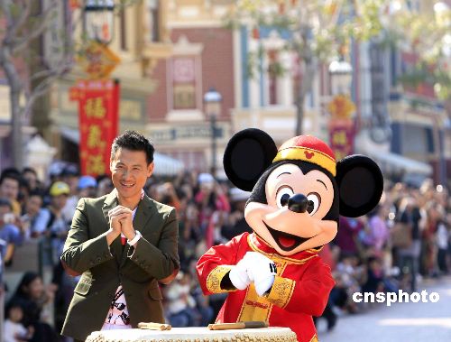一月十九日,張學(xué)友作為香港迪士尼樂園的名譽大使,亮相“福到滿城賀金!被顒樱騺碣e拜早年。中新社發(fā) 張勤 攝