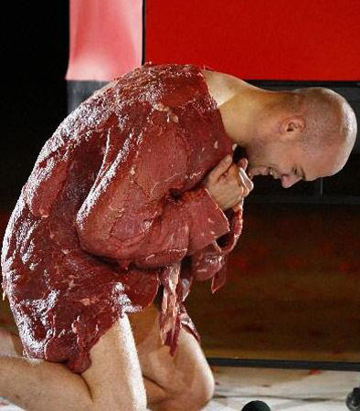 2008年7月19日,在克羅地亞的斯普利特,一名演員身穿生肉制成的演出服在舞臺(tái)上表演。
