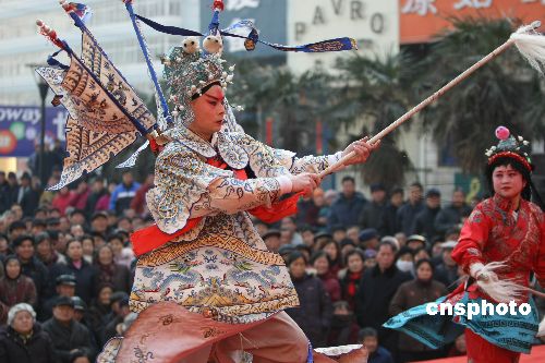 1月26日,安徽淮北市兩宮廣場露天戲臺上,市民們在觀看豫劇表演。當日,正月初一,淮北素有正月唱大戲的習俗。每年正月初一到十五,到處都能看到平地搭建的露天戲臺。中新社發(fā) 王璋聞 攝