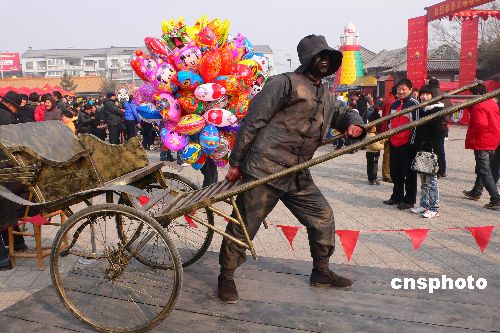 1月30日,河南省開封市翰園碑林里布置的真人活體雕塑引來不少游人駐足觀看。春節(jié)期間,河南省開封第十屆翰園春節(jié)祭祖大廟會上推出不同造型的真人活體雕塑,逼真的藝術(shù)效果讓人耳目一新。