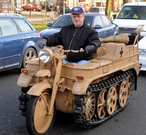 中新網(wǎng)2月2日電 據(jù)英國媒體報道,一位52歲的英國男子提姆·哈耶斯是夜班卡車司機(jī),四年前在網(wǎng)上購買了一輛德國二戰(zhàn)半履帶式坦克裝甲摩托車,去年在車子到手后,提姆白天一有空便在大街上飆坦克車解悶,放松自我。
