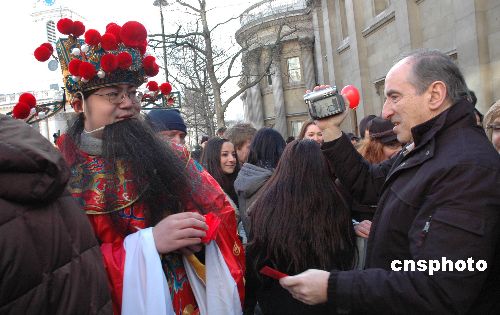 圖:中國“財(cái)神爺”倫敦派發(fā)新年紅包