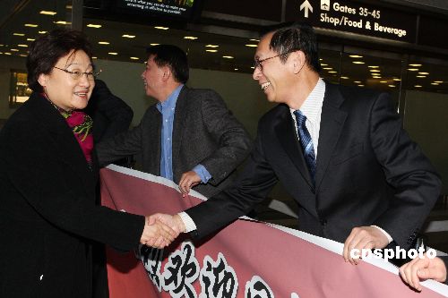 中國(guó)駐美大使周文重(左)前往機(jī)場(chǎng),迎接應(yīng)邀前來的中國(guó)國(guó)務(wù)院僑辦主任李海峰及"文化中國(guó)·四海同春"藝術(shù)團(tuán)一行抵達(dá)華盛頓。