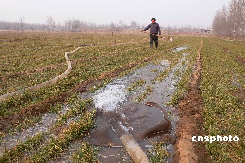 2月3日下午,開封市仙人莊村農(nóng)民在田間澆灌小麥。面對(duì)嚴(yán)重的旱情,河南省開封市各縣區(qū)積極組織群眾迅速行動(dòng),做好以抗旱澆麥為重點(diǎn)的麥田管理工作,力爭今年夏糧豐收。