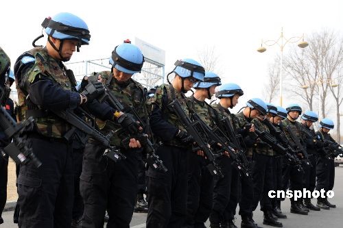 維和防暴隊(duì)員進(jìn)行激光模擬戰(zhàn)斗前準(zhǔn)備。中新社發(fā) 由永懷 攝