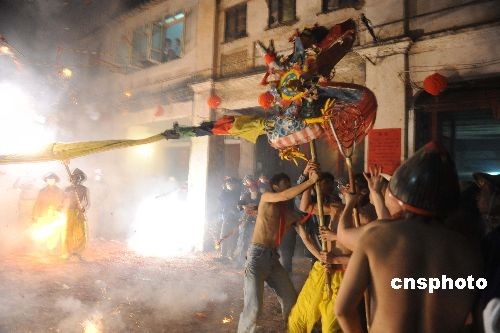 2月5日,農(nóng)歷正月十一,一場勇敢人的游戲——賓陽炮龍節(jié)在廣西賓陽縣舉行。代代起舞、終成獨(dú)特地方文化的賓陽炮龍節(jié)已有一千多年歷史。2008年6月,炮龍節(jié)被列為第二批國家非物質(zhì)文化遺產(chǎn)名錄。舞炮龍時,舞龍者頭戴藤帽,身系腰帶,赤膊上陣,任由鞭炮爆灼。龍到之處,各家各戶夾道歡迎,被喻為“中國狂歡節(jié)”。當(dāng)晚數(shù)萬名游客觀賞。中新社發(fā) 蔣雪林 攝