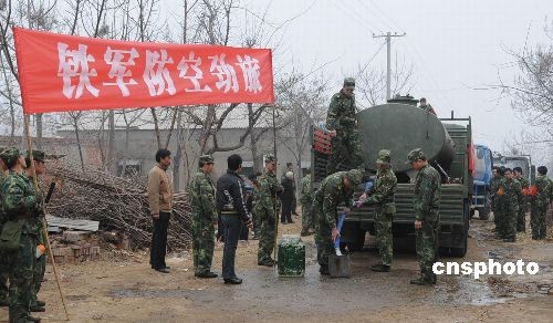二月六日上午,駐豫六百多名解放軍官兵專程趕赴民眾吃水困難的河南省新鄭市辛店鎮(zhèn)李莊村,將“甘霖”送入民眾家中。二00八年十一月以來,河南省氣偏高,干旱少雨,遭受自一九五一年以來的特大旱情,農(nóng)作物受旱面積達(dá)到百分之六十三點一,四千一百多萬畝麥田受旱災(zāi),部分地區(qū)出現(xiàn)臨時性人畜飲水困難。