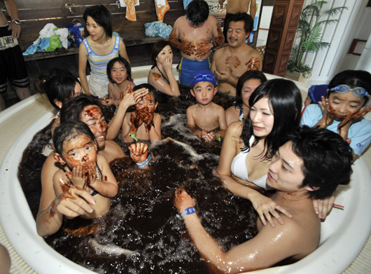 2月8日,游客們在日本神奈川縣享受奇特的“巧克力浴”。