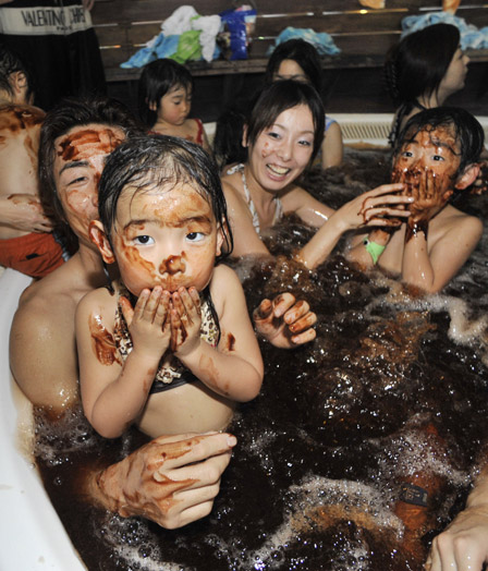 2月8日,游客們?cè)谌毡旧衲未ǹh享受奇特的“巧克力浴”。