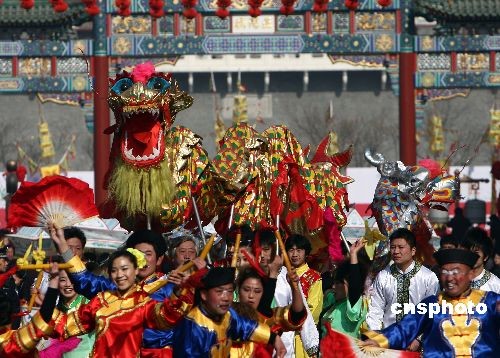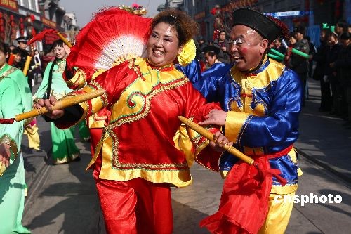 元宵節(jié)來臨,北京前門大街舉行民間花會踩街活動,借此宣告修繕一新的前門大街正式開街。踩街是一種中國傳統(tǒng)民間民俗藝術(shù)表演形式,類似國外的花車游行,表演隊伍邊行進(jìn)邊表演,百姓沿途觀看。中新社發(fā) 杜洋 攝