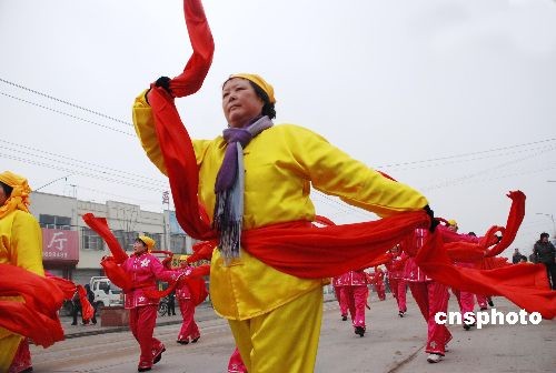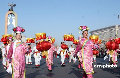 2月9日是元宵佳節(jié),山東省棗莊市山亭區(qū)各鄉(xiāng)鎮(zhèn)的農(nóng)民游藝隊(duì)開(kāi)展民俗“游街”活動(dòng),高蹺、竹馬、舞龍等傳統(tǒng)民俗表演精彩紛呈。中新社發(fā) 劉明祥 攝