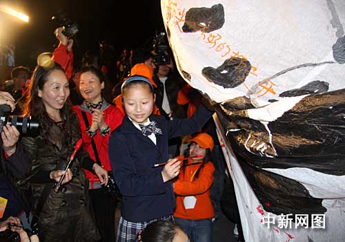 圖為應(yīng)邀隨團(tuán)來臺(tái)的十三歲四川“抗震救災(zāi)英雄少年”陽玉潔(中)正準(zhǔn)備在四川成都東羽蜀都燈會(huì)提供的印有大熊貓團(tuán)團(tuán)圓圓圖案的主燈上題字祈愿。記者 陳立宇 攝