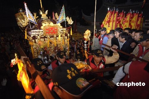 2月13日,臺(tái)灣信眾抬媽祖神像到湄洲島媽祖祖廟進(jìn)香謁祖。當(dāng)日,428名臺(tái)灣媽祖信眾第一次經(jīng)由海上客運(yùn)直航抵達(dá)湄洲島媽祖祖廟進(jìn)香謁祖。這是2008年底海峽兩岸簽訂“兩岸海運(yùn)協(xié)議”后的第一個(gè)兩岸海上客運(yùn)直航活動(dòng),也是湄洲島口岸繼與金門、馬祖實(shí)現(xiàn)海上客運(yùn)通航后的又一突破。中新社發(fā) 王東明 攝