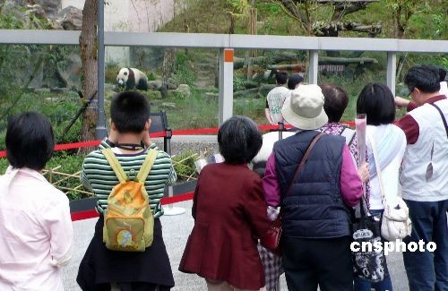 圖為觀眾排隊依次參觀在戶外活動的大熊貓。中新社發(fā) 路梅 攝