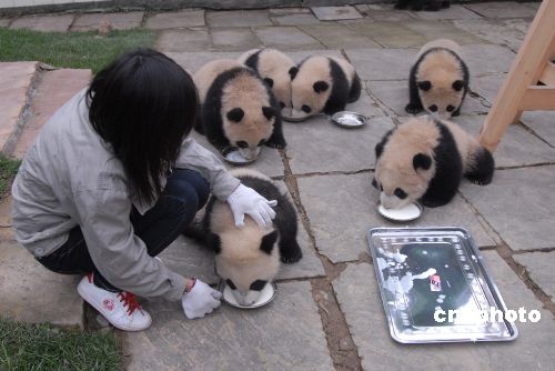 5.12汶川大地震,臥龍核桃坪熊貓基地遭到重創(chuàng),為了保證國寶大熊貓的安全,臥龍50多只大熊貓被分批緊急疏散轉(zhuǎn)移,有27只熊貓轉(zhuǎn)移到成都、北京、福州等地寄養(yǎng),其余轉(zhuǎn)移至雅安碧峰峽基地。自2008年7月6日早晨7:52和8:36,臥龍大熊貓“幗幗”順利產(chǎn)下全球首對雙胞胎之后,臥龍雅安基地2008年共有13只熊貓幼仔成活。2月12日雅安碧峰峽熊貓基地為這13只熊貓寶寶舉行簡單的入住熊貓幼兒園的儀式。中新社發(fā) 羅小韻 攝