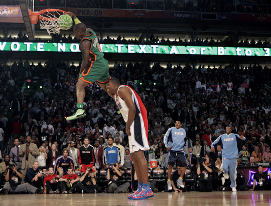 中新網(wǎng)2月15日電 北京時(shí)間2月15日,NBA全明星周末繼續(xù)進(jìn)行,其中深受全世界球迷喜愛(ài)的扣籃大賽火爆上演。身高只有1米70的“小土豆”內(nèi)特-羅賓遜在決賽中做出了飛躍上屆扣籃大賽冠軍、身披“超人”斗篷的霍華德后扣籃的動(dòng)作,這個(gè)被稱(chēng)為“飛躍超人”的扣籃使羅賓遜繼2006年后第二次獲得扣籃王,成為2009年全明星周末的扣籃冠軍。