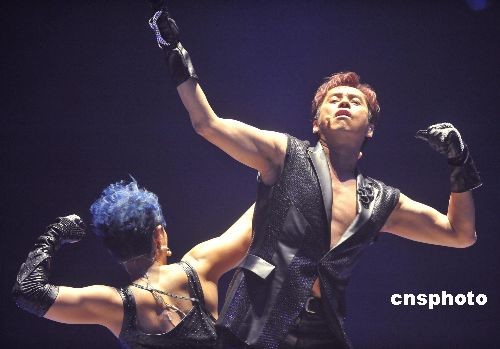 二月十四日晚,“香港二零零九東亞運動會.左麟右李演唱會”在香港紅磡體育館作尾場演出。圖為歌星譚詠麟、李克勤特別為是次演唱會強身,兩人演出時不忘展示麒麟臂及胸肌。 中新社發(fā) 鄧慶樂 攝