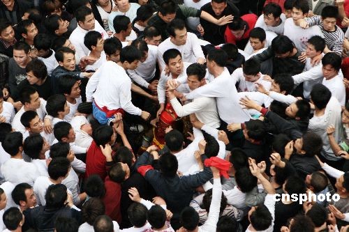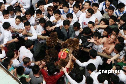 2月16日,農(nóng)歷正月二十二,廣東汕頭市鹽灶村舉行獨特的傳統(tǒng)“搶財神”活動;顒又,一些被挑選出來的村民將廟里的神像抬出來游行,其他村民則競相涌上前觸摸甚至奪取、拖行神像。按照村里的老話:“老爺公喜歡拖,越拖越興旺!边@一獨特盛會吸引了數(shù)千人前來助威觀看,比過春節(jié)還熱鬧。