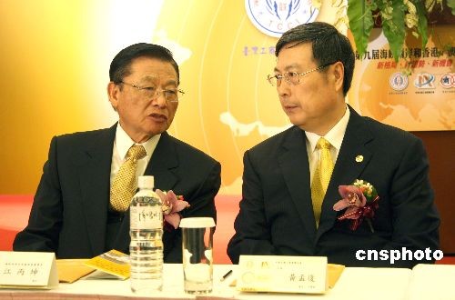 圖為臺灣;鶗麻L江丙坤(左)與中華全國工商業(yè)聯(lián)合會主席黃孟復(fù)交談。中新社發(fā) 陳立宇 攝
