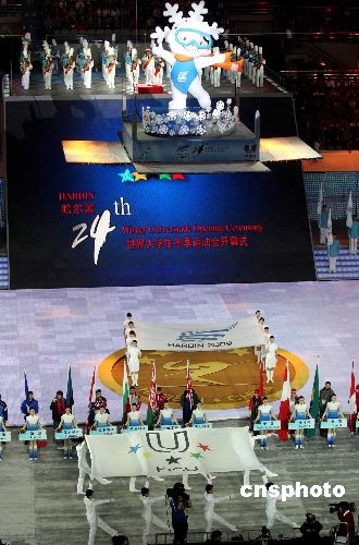 2月18日,第24屆世界大學(xué)生冬季運(yùn)動會開幕式在哈爾濱國際會展中心體育館隆重舉行!氨⑶啻、未來”,哈爾濱大冬會在熊熊圣火的映襯下揭開大幕,在未來10天內(nèi)來自45個參賽代表團(tuán)青春洋溢的冰雪健兒們將在賽場上展開競逐!本屆大冬會是中國首次承辦世界綜合性冬季體育盛會,也是繼北京奧運(yùn)會和殘奧會后中國又一次承辦的國際性賽事。中新社發(fā) 富田 攝