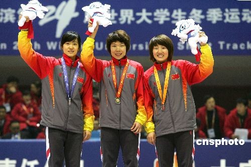 2月19日,世界大冬會(huì)短道速滑女子1500米決賽結(jié)束,中國(guó)隊(duì)包攬前三名,周洋以2分31秒658奪得金牌,這也是中國(guó)代表團(tuán)在本次大冬會(huì)奪得的首枚金牌,劉秋宏和孫琳琳分列2、3位。中新社發(fā) 富田 攝