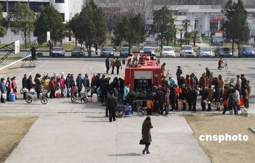 2月21日,江蘇省鹽城市各主干道上,消防車輛正為市民輸送安全用水,確保鹽城市民能夠安心喝上未被污染的自來水。由于水廠受酚類化合物污染,鹽城市區(qū)2月20日出現(xiàn)大面積停水,居民生活受到較大影響。造成本次停水的水源地污染原因已經(jīng)確認,偷排污水的鹽城標新化工有限公司被責令關(guān)閉,法人代表等相關(guān)責任人被采取強制措施。圖為鹽城市市委黨校內(nèi)前來取水的市民排成了長龍。中新社發(fā) 童盛 攝