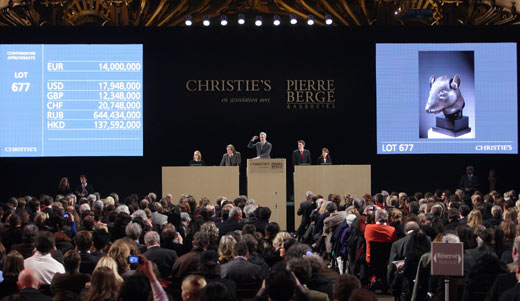 法國佳士得拍賣行二十五日晚間在巴黎拍賣中國圓明園流失文物鼠首和兔首銅像,兩個獸首分別以一千四百萬歐元的價格被神秘的電話買家買走。