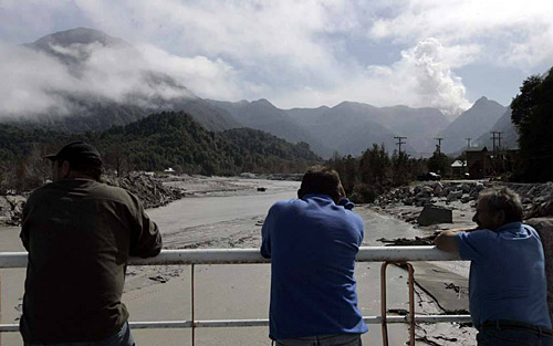 2月26日,在智利首都圣地亞哥以南1200多公里的柴滕市,當(dāng)?shù)鼐用裼^看噴發(fā)煙霧的柴滕火山。佩德羅·門多薩 攝
