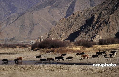 2009年初春,從拉貢公路上望去,成群的牦牛正在趟過拉薩河。由于生態(tài)環(huán)境的改善,西藏的野牦牛數(shù)量增多了,一些地方經(jīng)常發(fā)生野生公牦牛趁夜色,摸進(jìn)村子拐跑家養(yǎng)母牦牛的事情。中新社發(fā) 廖攀 攝