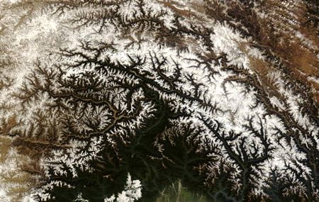 青藏高原冬季衛(wèi)星圖:NASA土地衛(wèi)星上高清代分光成象儀(MODIS)拍攝到了青藏高原的真彩圖片,可以看到被稱為"世界屋脊"的高原上,山頂?shù)狞c點積雪和部分結(jié)冰的湖面。