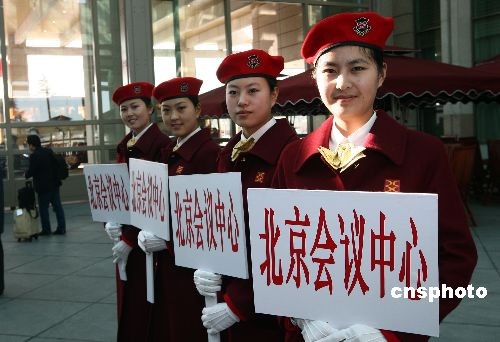全國(guó)“兩會(huì)”召開在即,各賓館駐地的服務(wù)員3月1日在北京首都機(jī)場(chǎng)準(zhǔn)備迎接各地的代表、委員抵京。中新社發(fā) 杜洋 攝