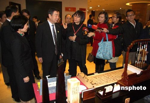 圖為鄭欣淼(左二)在臺(tái)北故宮博物院院長周功鑫(左一)的陪同下,參觀臺(tái)北故宮博物院禮品部,并觀賞依據(jù)唐懷素自敘帖制作的禮品。