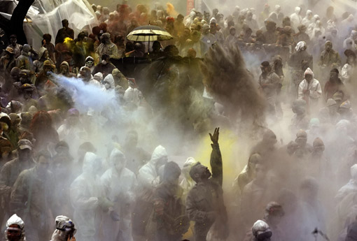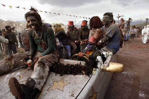 3月2日,人們在希臘雅典西北小城加拉希迪的街道上用加了各種天然顏料的面粉互相投撒,表達祝福。