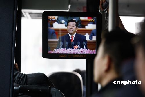 3月3日,全國(guó)政協(xié)十一屆二次會(huì)議在北京人民大會(huì)堂開幕,北京市民在公交車上通過(guò)移動(dòng)電視收看相關(guān)報(bào)道。中新社發(fā) 鄭雄增 攝