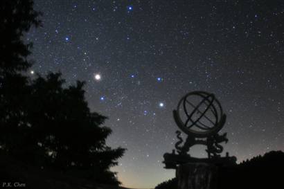 每當(dāng)夜晚,你走出房間可能會(huì)在夜空中看到一顆非常明亮、略帶微紅色的物體,那就是火星。在本圖中,御夫座群星中間的那顆最大亮點(diǎn)就是火星,恰好與夜幕下的中國(guó)渾天儀遙相呼應(yīng)。渾天儀是清康熙年間欽天監(jiān)官員南懷仁等制造,并于1669年進(jìn)呈朝廷的。儀器由三層環(huán)架組合、上圓下方的造型,是中國(guó)傳統(tǒng)渾天儀的表現(xiàn)形式,但在刻度和設(shè)計(jì)原理上卻采用了西方法度及5世紀(jì)托勒密的地心說(shuō),可見(jiàn)這是中西科技融合的作品。由于這件渾天儀能夠科學(xué)地演示日月交食之成因,一經(jīng)進(jìn)入宮廷使用,對(duì)于康熙朝再度應(yīng)用西洋歷法、改進(jìn)中國(guó)測(cè)天儀器等都起了積極的作用。