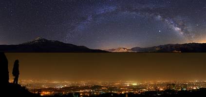 “夜空下的世界”項目的另外一重要目標,就是提醒人類注意城市燈光污染,F(xiàn)在城市明亮的燈光已讓人們很難看到夜空中的星星。本圖上半部分的弧形,其實就是伊朗北部上空的銀河,而下半部分則是燈光污染的德黑蘭。耀眼的燈光在照亮世界的同時也帶來了燈光污染,太亮的燈光可能導致居民無法安睡、司機駕車炫目等。對天文學家和天文愛好者來說,眾多的強亮光還嚴重影響他們觀測星空。世界多個國家已經開始與燈光污染作斗爭,比如在一些新開發(fā)的地區(qū),要求安裝不正對空中的燈光裝置,鼓勵夜晚照明燈光全部射向地面。
