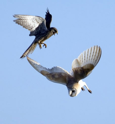 猛禽“空戰(zhàn)”。圖為一只谷倉貓頭鷹在白天覓食時(shí)遭到兩只茶隼的伏擊的照片。