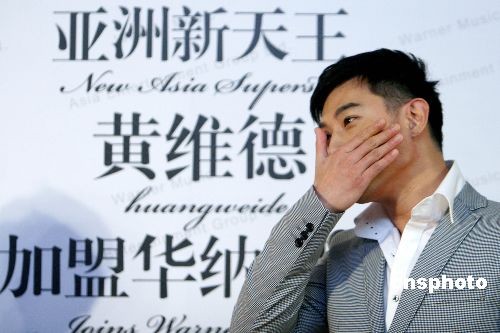 2009年3月9日,臺灣影視紅星黃維德加盟華納唱片簽約發(fā)布會在北京隆重舉行。蔡依林恩師陳澤杉送上繡有“金榜題名”的卷軸。事逢前日伊能靜博客突發(fā)感言表明已和庾澄慶離婚,使?fàn)渴珠T中的主角黃維德再次被推上風(fēng)口浪尖。發(fā)布會中黃維德感嘆生活多揣,看到依舊堅(jiān)定支持的歌迷突然落淚、抽咽。隨后的媒體訪問在問題逐漸深入的過程中黃維德最終難再支撐,匆匆離去。中新社發(fā) 袁方 攝