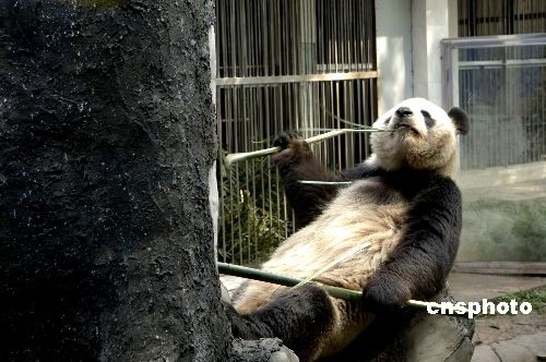 三月十二日,去年從四川地震災(zāi)區(qū)轉(zhuǎn)移到福州的大熊貓?jiān)诟V菪茇埵澜缋,躺在明媚?yáng)光下,悠閑地吃著竹子。中新社發(fā) 王東明 攝