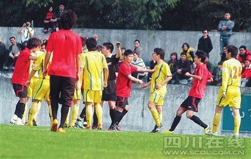 近乎荒誕的“賭球”讓成足與川足兩兄弟更像是賭氣。于是乎曾經(jīng)在一棟樓里朝夕相處的汪嵩、劉成、徐洋、干穎波、劉宇形同路人,好幾次幾人之間的對話都亮出了鞋底鞋釘。拉扯,拉扯到了將場邊的替補席撞得人仰馬翻;飛鏟,飛鏟到場上的草皮飛濺。這是足球么?球迷似乎都沒有思考這樣的問題,只是不斷地嘀咕著:“太狠了!”