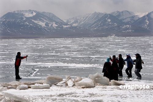 游客在冰封的湖面上合影留念。