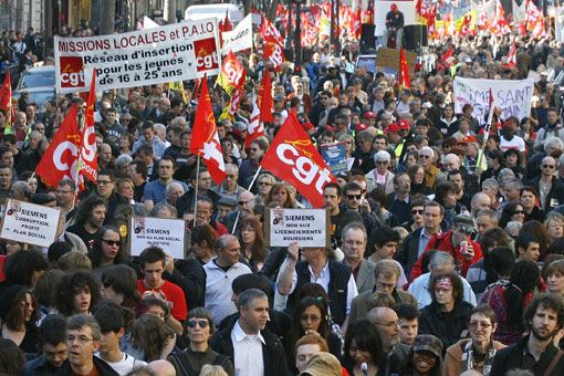 3月19日法國各大工會在全國各地聯(lián)合組織罷工和示威游行等活動,抗議政府在應(yīng)對當(dāng)前經(jīng)濟(jì)危機(jī)過程中忽視勞動者權(quán)益和社會福利。
