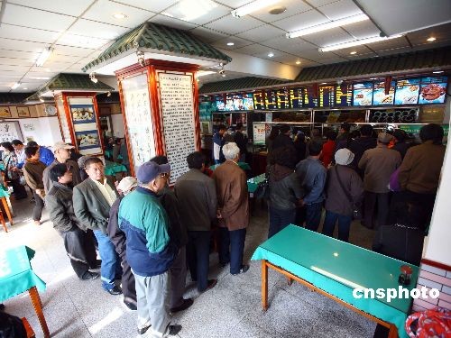 3月20日,迎來24節(jié)氣中的“春分”,意思是說春天過了一半。按照老北京的習(xí)俗,“春分吃豆面糕(驢打滾),避邪祈!薄1本┲o(hù)國寺小吃連鎖店為這天的到來準(zhǔn)備了1萬多個驢打滾。圖為在護(hù)國寺小吃店了排隊買驢打滾的民眾。中新社發(fā) 富田 攝