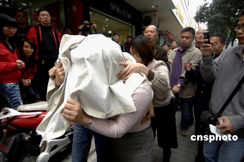 三月二十三日上午十一時十分左右,三名被解救的人質(zhì)掩面走出典當行。中新社發(fā) 王東明 攝