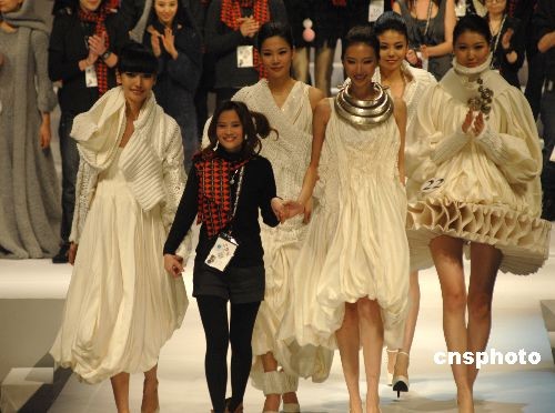 3月24日,中國國際時裝周(09/10秋冬季系列)在北京隆重開幕。來自18個國家的31位青年設計師在“漢帛獎”上的角逐,最終廣東青年設計師陳嘉慰的作品“點-線-面”獲得金獎。今年第17屆的“漢帛獎”大賽主題為“國慶招待會”。中新社發(fā) 樊建恩 攝
