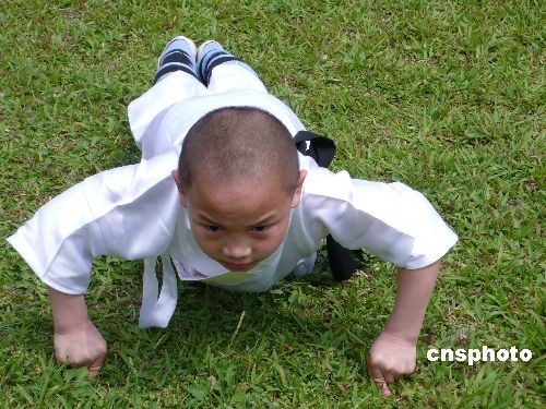 北京元鴻少林功夫團(tuán)抵臺(tái)進(jìn)行武術(shù)交流。圖為“大力神童”陸地在臺(tái)北表演一指禪俯臥撐。中新社發(fā) 鄧敏 攝