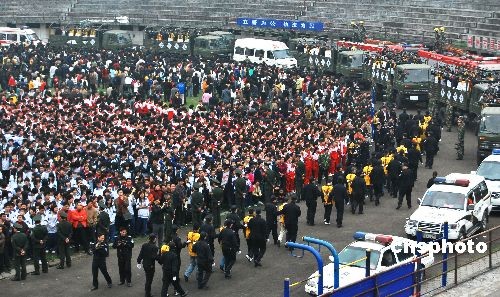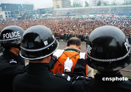 2009年3月26日,湖南省郴州市在東風(fēng)廣場召開公捕公判大會,對一批犯罪嫌疑人和犯罪分子進行公開刑拘、逮捕和判決,對罪行極其嚴(yán)重的犯罪分子判處死刑。 中新社發(fā) 賀茂峰 攝