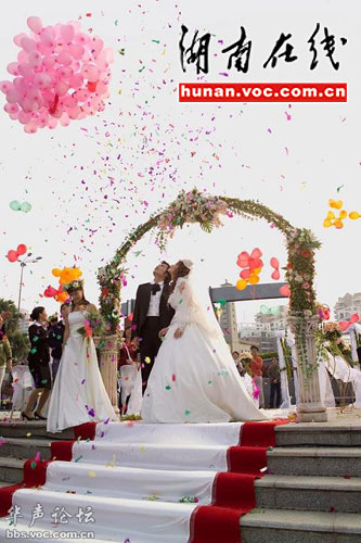 從帖子里貼的圖片來看,婚禮確實陣仗宏大,圖片中的場景大多為長沙當?shù)氐慕志,例如長沙湘江上標志性的挪亞游輪等。但亦有細心網(wǎng)友提出疑問,場景中出現(xiàn)的新娘妝容及打扮均有不同,而且有一些照片甚至出現(xiàn)了數(shù)對新人,網(wǎng)友懷疑是集體婚禮。