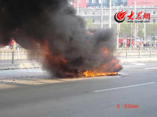 8日早7:50,濟南市歷山路與和平路路口,一輛轎車在行駛途中突然爆燃,熊熊大火和濃煙頓時彌漫方圓數(shù)十米,迅速而來的消防人員2分鐘撲滅大火,自燃轎車已經(jīng)面目全非,只?蚣埽也o人員傷亡。記者用手機拍下了整場火災的全過程。